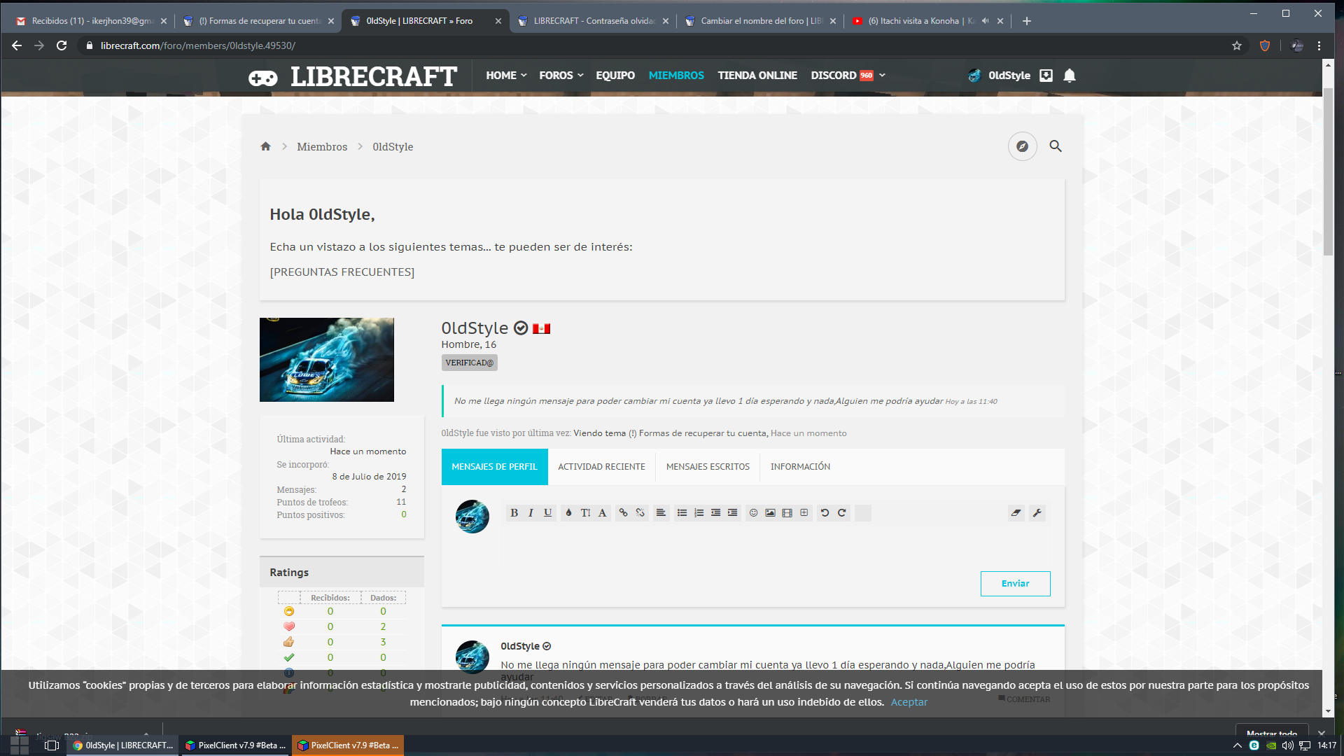 Alguien con experiencia me ayuda con mi problema, al entrar ami cuenta de librecraft.com pongo correctamente mi contraseña,pero sale incorrecta,Yo ya hice todo el formulario que me pidió para recuperar mi contraseña,pero no me llega ningún mensaje al Ver adjunto 26134 ya hice esto pero no me llega el mensaje ami cuenta del foro Ver adjunto 26135