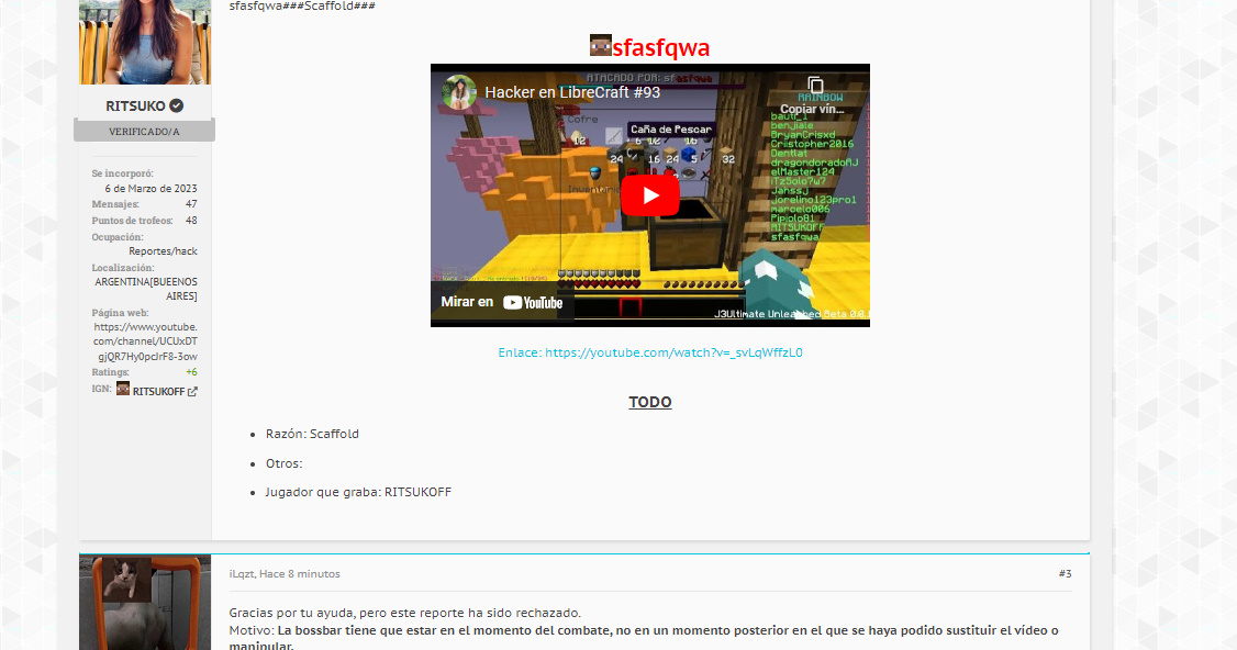 [​IMG] [​IMG] como puedes ver en la segunda imagen No hay #codigo, por lo tanto, el reporte es inválido para ser aceptado, hay ciertas modalidades en donde se pueden aceptar los reportes sin que este presente la bossbar de arriba siempre y cuando este presente el #codigo en el momento de la infracción, tipo en jail full pvp etc. y por último el jugador ya fue baneado así que todo en orden, buen día.