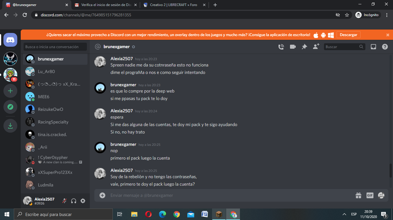 Yo no me busco nada, de hecho ahí le hable para ver si podía recuperar alguna cuenta. Por librecraft y por los mensajes de discord me di cuenta que es agresor, manipulador, nada justifica sus hechos.