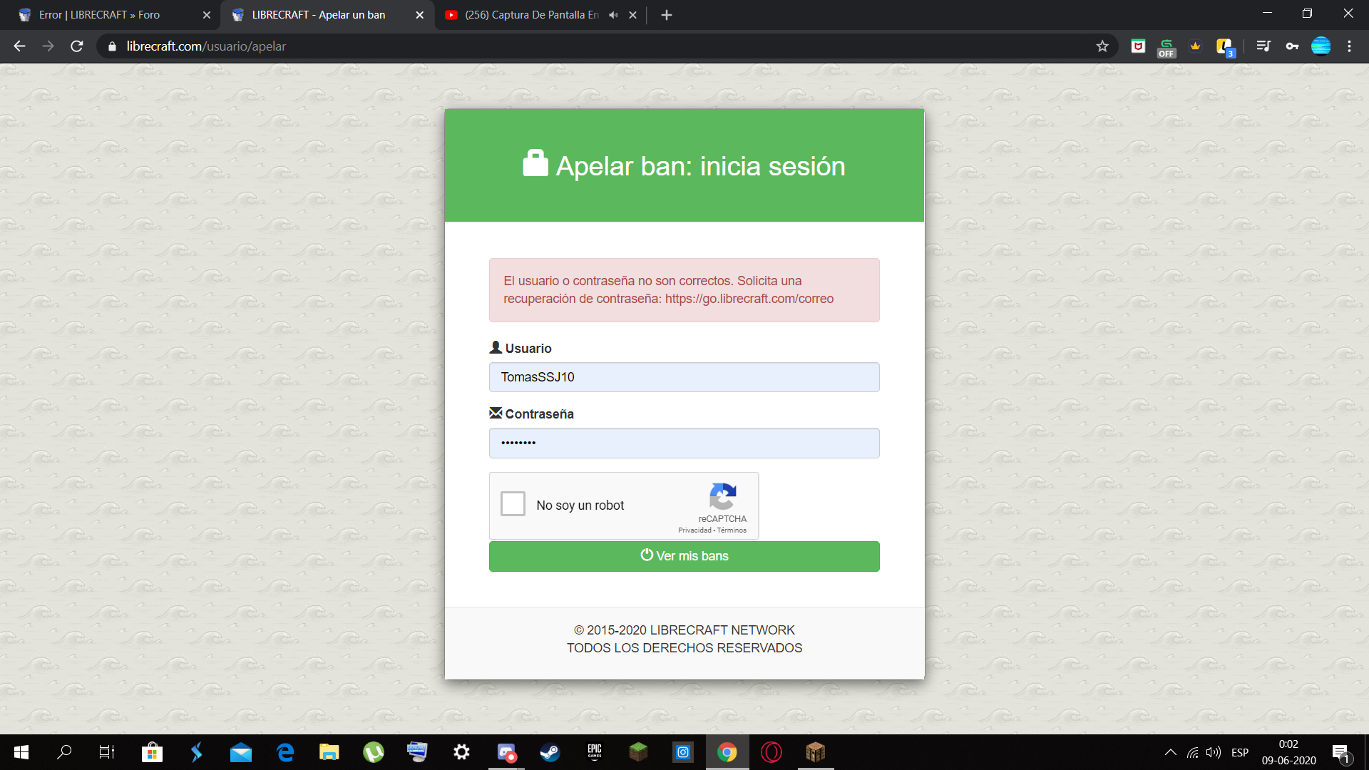 Si nada de eso funciona, y te sigue saliendo el error, si tienes asociado un correo electrónico puedes restablecer tu contraseña con el enlace que ahí te muestra: https://go.librecraft.com/correo