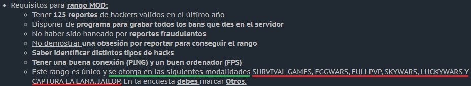 Tenía una duda, ya que estaba leyendo casualmente los requisitos para ser staff, y me di cuenta de que en la sección donde explica los requisitos para el rango Mod, no se incluyen las modalidades de Zombis, Bedwars ni The Towers.