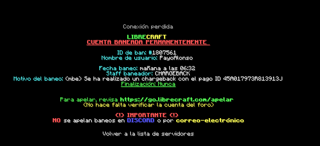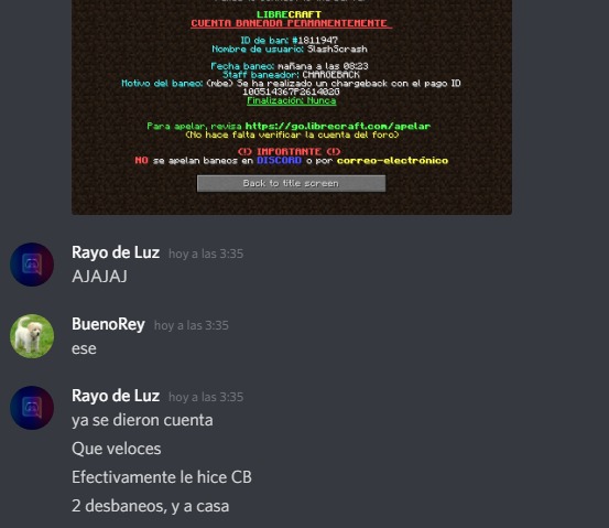 A mi también recientemente me han baneado por "ChargeBack" gracias al señor Mario o más conocido como GatofuMC que al parecer se ha enterado de que yo le pasé unas pruebas que lo delataban de hacer cb para banear a usuarios y me hizo exactamente lo mismo, como yo tenía comprado un unban, compró el segundo, luego hizo chargeback y pum baneado, sinceramente me parece deleznable que exista y aún funcione esta manera para banear a usuarios que "te caen mal", estoy esperando una respuesta por parte del staff pero aún no me han dicho nada concreto