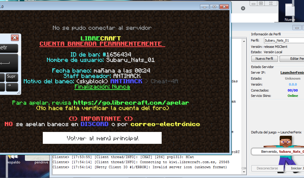 Efectivamente. El antihacks detecta por error a usuarios con lag, mal internet, bajos fps o cliente no permitido, mientras todo haya sido un simple error y nunca hayas hecho algo no permitido en el servidor se te desbaneara, apela: https://librecraft.com/usuario/apelar
