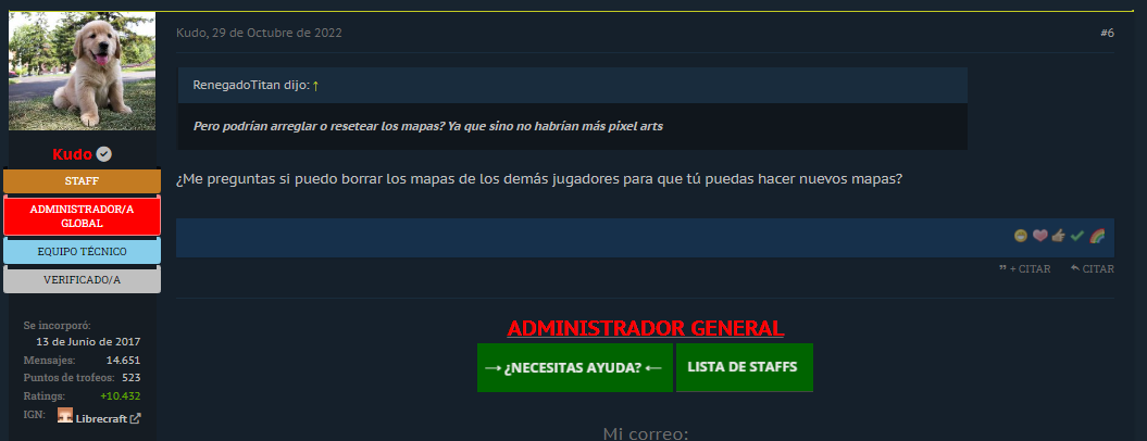 Sobre esto, no recuerdo muy bien y nose si hablen del "bug" de que los mapas lleguen al limite y ya no se pueda hacer pixeles me acuerdo que ese bug aparecio en survival y kudo dijo que para solucionar eso tenía que poner varios mapas en blanco (en total 150 cofre dobles de mapas en blanco) el podía hacerlo pero no quería, unos chicos _LowParty y Danicrack005 terminaron haciendo para que al final esten baneados, tremendo. Pero no es por malas que kudo no quiera, si no que, al reiniciar los mapas, los pixel arts anteriores se actualizan dependiendo de que tan rapido vaya osea.. Limite= Mapa en blanco #99999 *Lo reinician poniendo varios mapas ne blanco *ya resuelto el "bug", empiezan a hacer pixel arts rapidamente* Los anteriores pixel arts: Desaparesco porque uno ya tomo mi papel, nos vemos Ejemplo: *Un pixel art que supuestamente debería decir AVISO, se actualiza a un pixel art que es un perro sandia u otro dibujito rarito* Kudo: Es por eso que no quería "arreglar" ese "bug", porque sé que se harían problema con ello. PD: Mi pixel art de Pan Tortuga se actualizo a un furro, ayuda estoy en depresion.